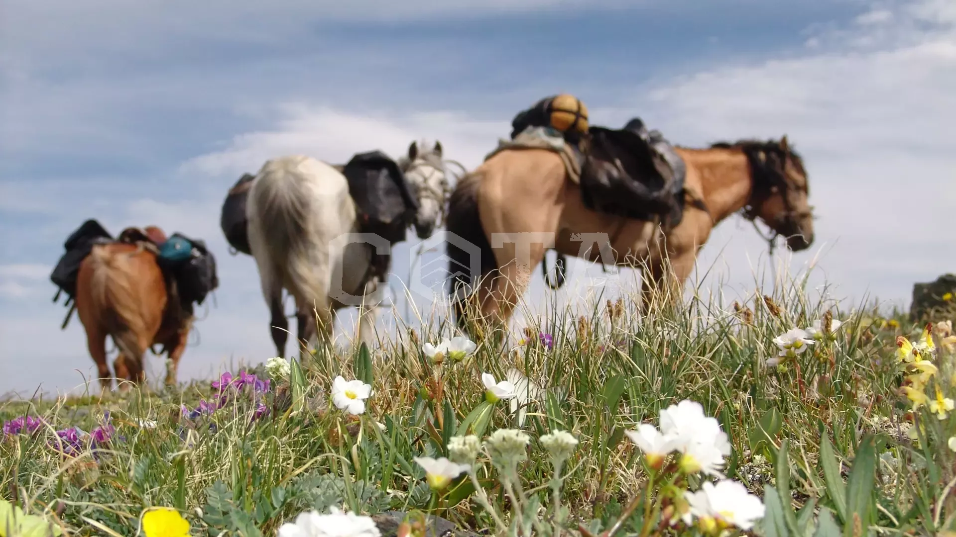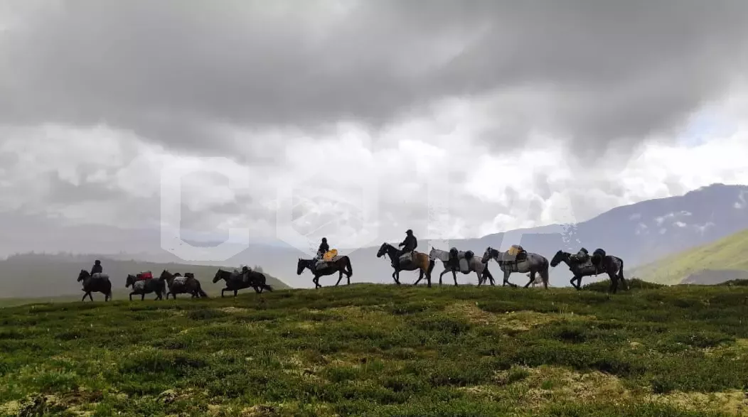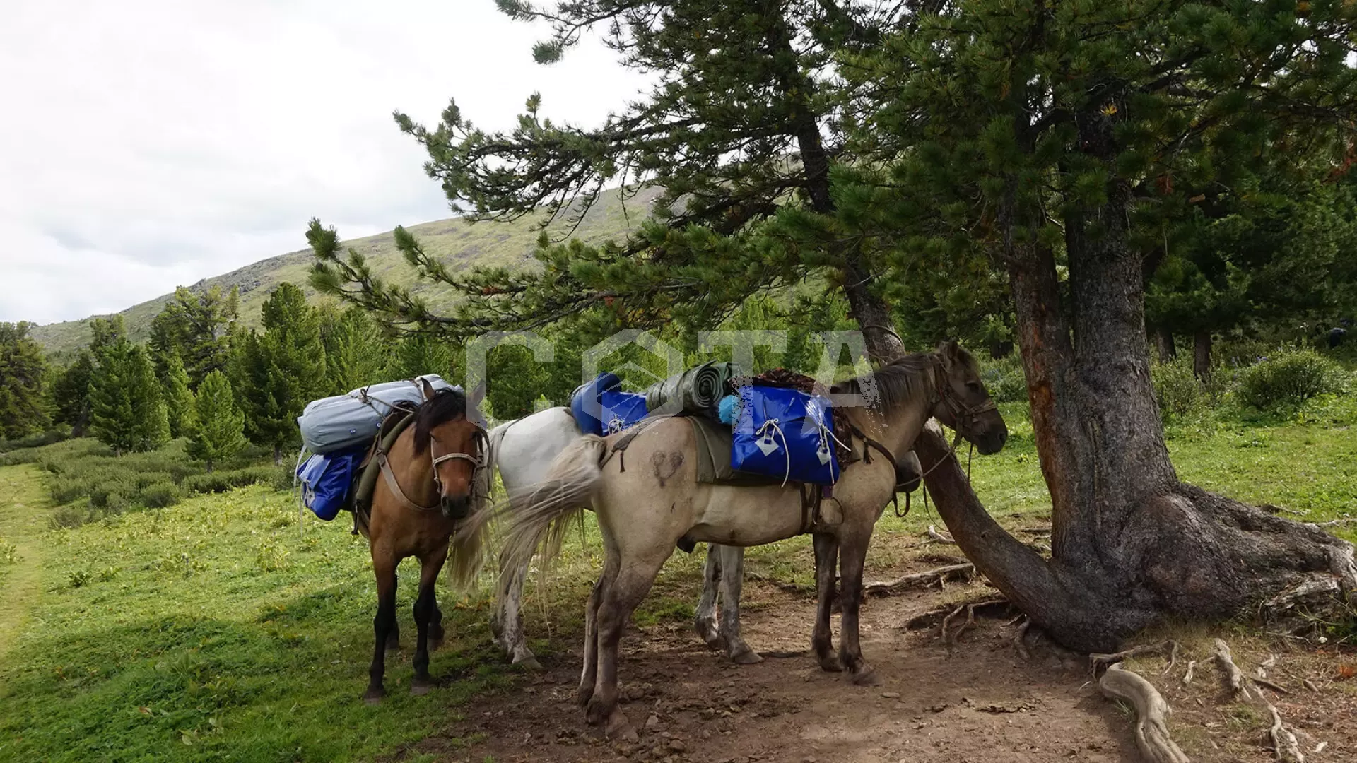 На пешей части маршрута группу сопровождают вьючные кони (перевозят основной груз: палатки, спальники, продукты, костровое оборудование, личные вещи и др.)